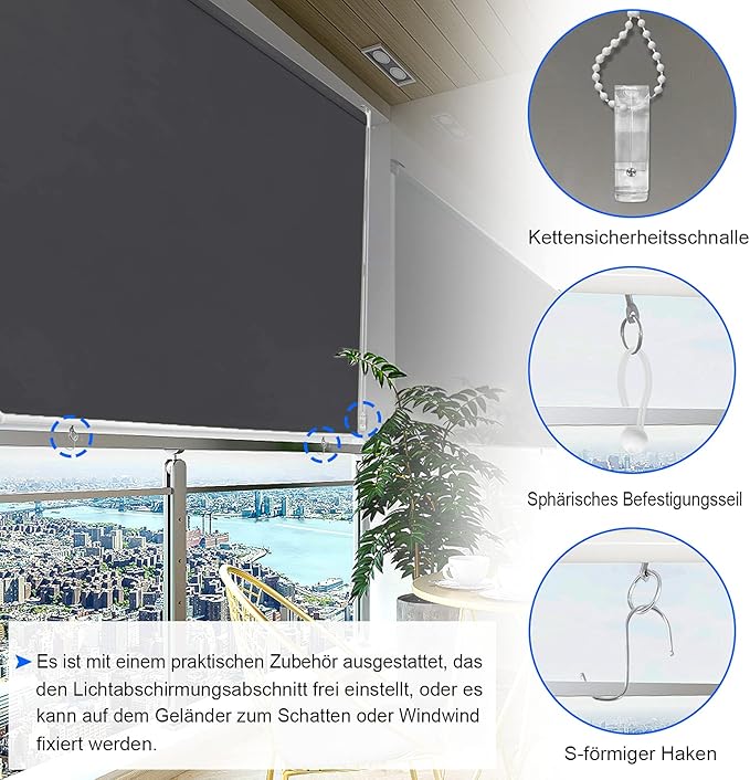 Lengvas montavimas: Išorinė roletinė žaliuzė tvirtinama prie sienos arba balkono pagrindo naudojant komplekte esančias montavimo medžiagas. Grandinėlės pakėlimo mechanizmas gali būti sumontuotas kairėje arba dešinėje pusėje. Elastingi kabeliniai dirželiai užtikrina, kad audinys visuomet išliktų optimaliai įtemptas.