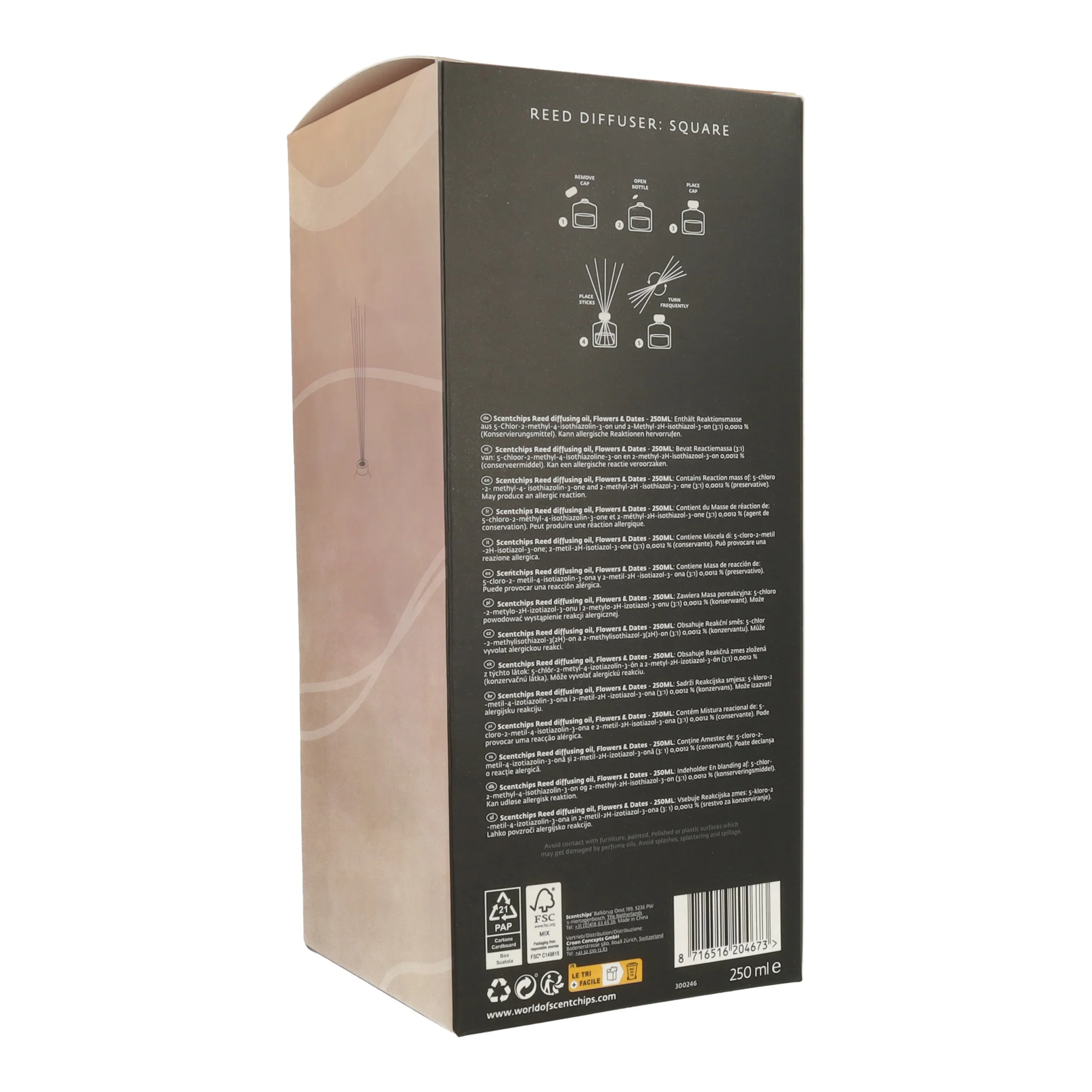 Tikras malonumas – puikiai tinka dovanoti ar pasilepinti patiems! Šis rožinės spalvos kvapų difuzorius pripildytas švelnaus „Flowers & Dates“ aromato. Rinkinyje taip pat yra 7 juodos kvapų lazdelės, kad galėtumėte ilgai mėgautis šiuo kvapu savo namuose.