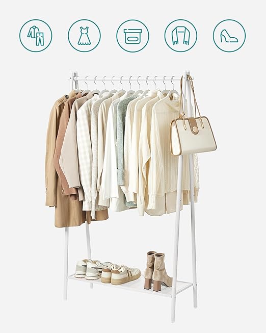 SONGMICS Drabužių Kabyklos Stovas su Lentyna – Plieninis, Tvirtas ir Kompaktiškas. Baltos spalvos.