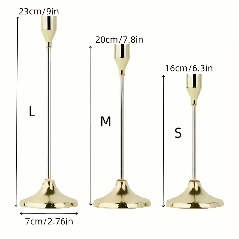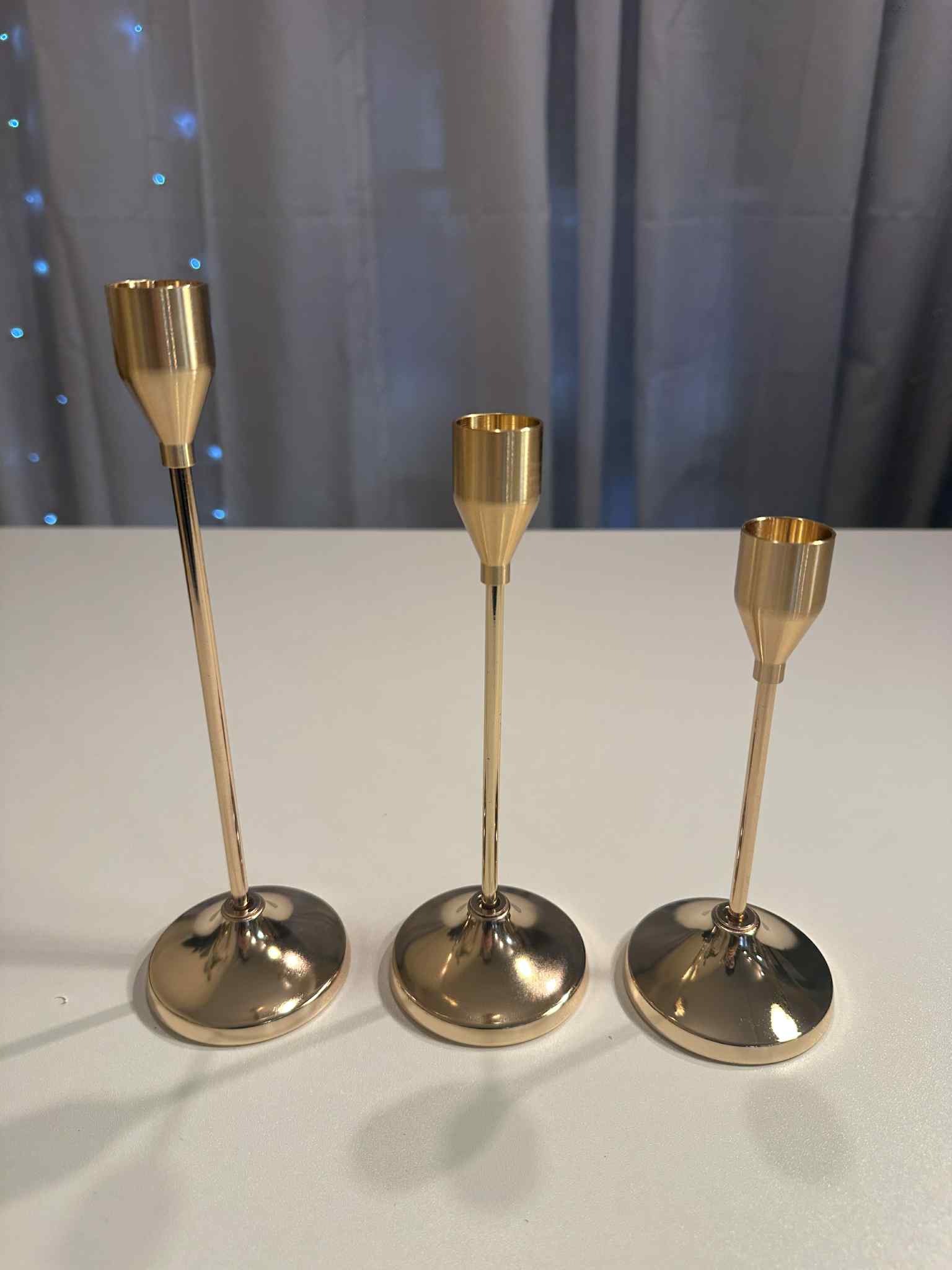 Elegantiškos aukso spalvos, trijų dydžių žvakidės. Komplektas – 3 vnt.