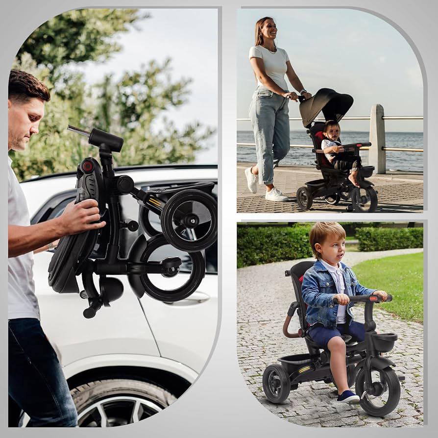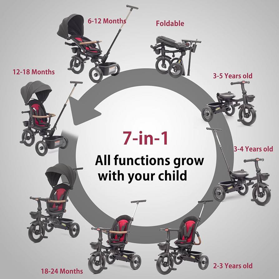 UBRAVOO 7 in 1 sulankstomas triratukas vaikams nuo 6 mėn. iki 5 metų su priekiniais žibintais, vienos pakopos sulankstomu stabdžių pedalu, prailgintu stogeliu ir nuimamu apsauginiu turėklu.